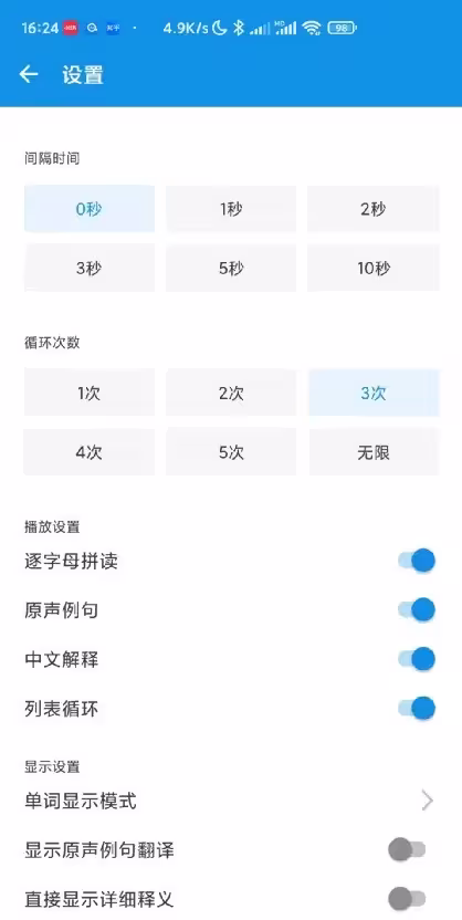 我的设置如下。每个单词都3次,逐字母拼读有助于我们记忆单词,中文解释也可以读噢。